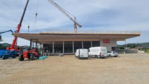 A company building is currently being constructed in Cologne for a company that works in the international distribution of plastics and elastomers. The new building, with an underground car park, ground-level storage areas, and offices above, is characterized by its high